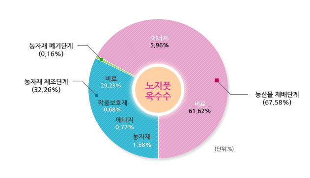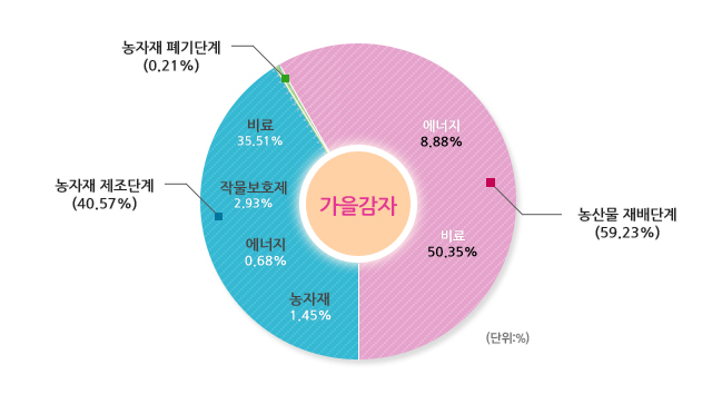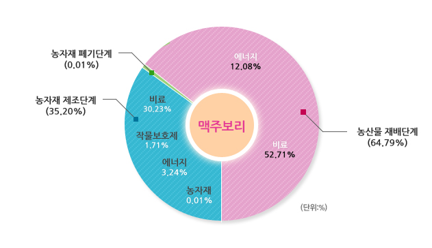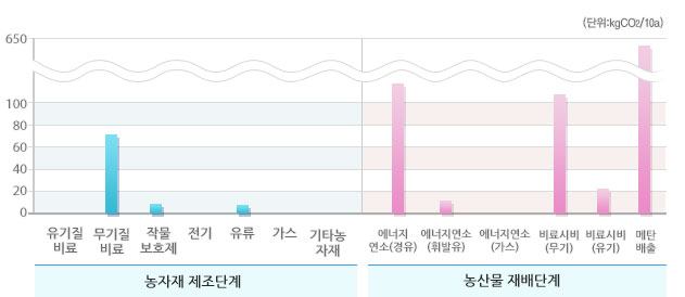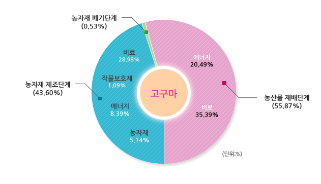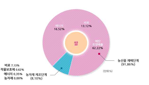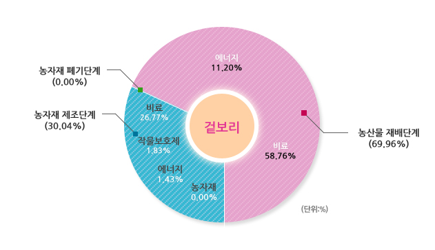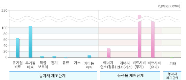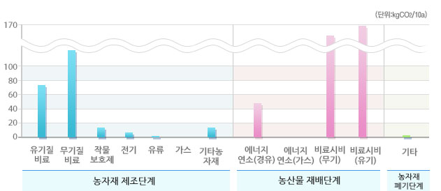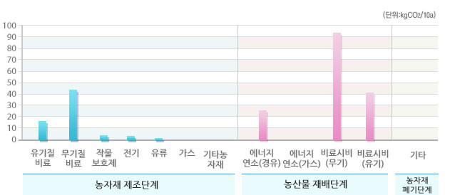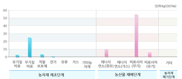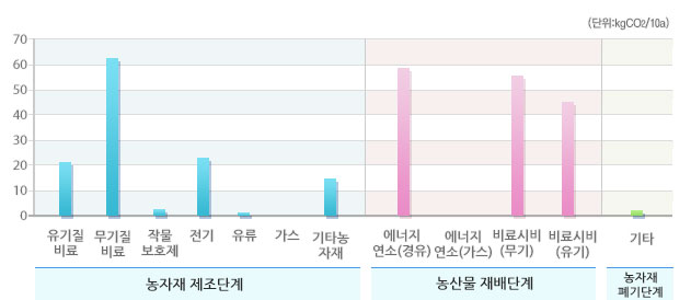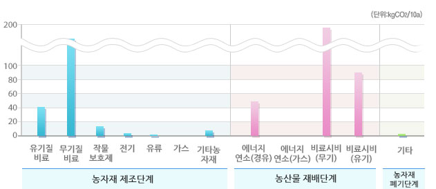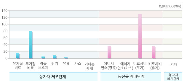 선택된 농산물의 우리나라 평균 온실가스 배출원별 배출비율 및 배출량입니다.